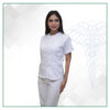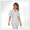 Descripción: Uniforme de dos piezas color blanco, blusa CON BORDADO en el cuello, cierre delantero, cuello militar y escote en forma de corazón, màs dos bolsillos inferiores con cierre para mayor seguridad. Pantalón de pretina con cierre y bastas rectas.