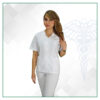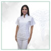 Descripción: Uniforme de dos piezas color blanco, blusa con cierre delantero cubierto, cuello militar con vivo, más dos bolsillos inferiores . Pantalón de pretina con cierre y bastas rectas.