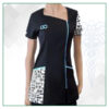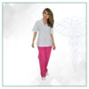Descripción: Uniforme de dos piezas combinado, blusa cuello alto con cruce, más bolsillos laterales internos, vivos en contraste en cuello y mangas, pantalón de elástico con cordón ajustable y bolsillos laterales internos, basta abierta.